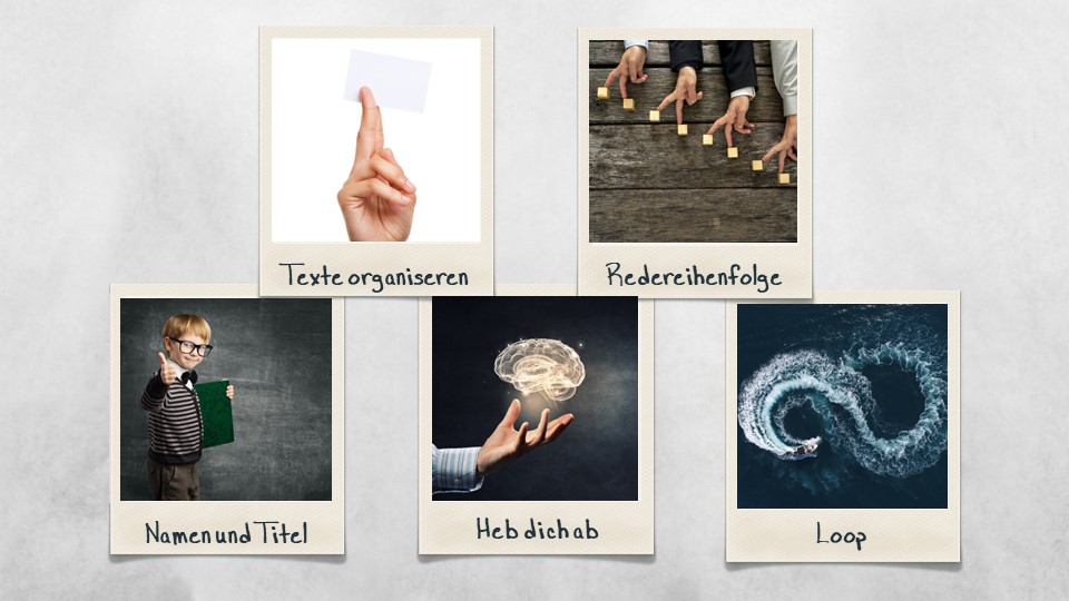 Loop: Eine schöne Technik für deine Grußworte ist der Loop oder Zirkelschluss. Um ihn anzuwenden, greifst du einfach etwas, das du am Beginn deiner Rede gesagt hast, am Ende noch einmal auf. So gibst du deiner Eröffnungsrede einen harmonischen Abschluss.