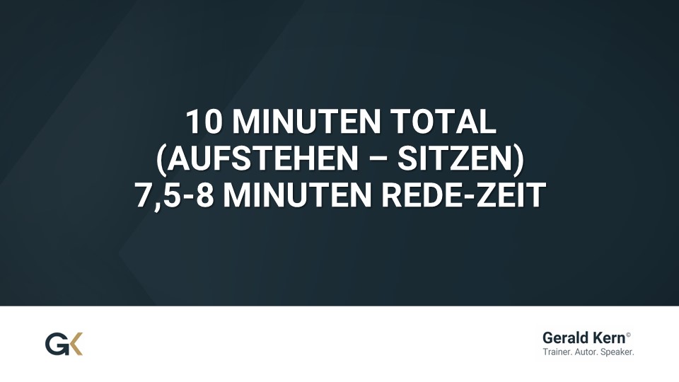 Achtung: Bei diesen zehn Minuten musst du auch die Anmoderation, den Applaus des Publikums und den Übergang zum nächsten Redner miteinberechnen. Somit bleiben für deine Eröffnungsrede ca. siebeneinhalb bis acht Minuten reine Redezeit übrig.