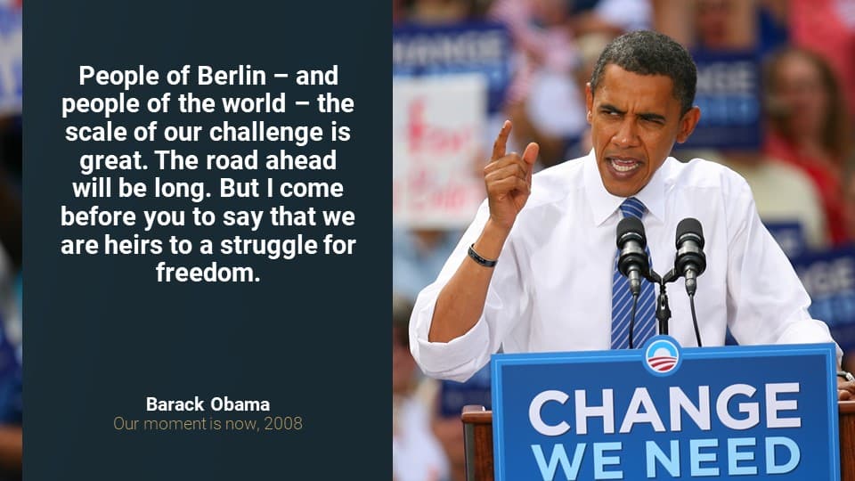 Zitat Barack Obama mit Bild von ihm aus der Rede "Our moment is now"