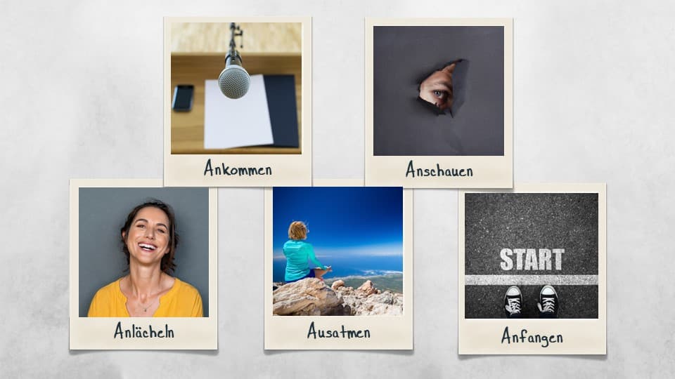Dieser ganze Prozess dauert nach dem Ankommen ungefähr 5 Sekunden lang. 5 A’s = 5 s. Wenn du dir vor deiner Ansprache diese 5 Sekunden Zeit nimmst und dann erst zu sprechen beginnst, wirst du ein besseres Ergebnis erzielen und die Zuhörer mit deinen Themen garantiert von Anfang an abholen.