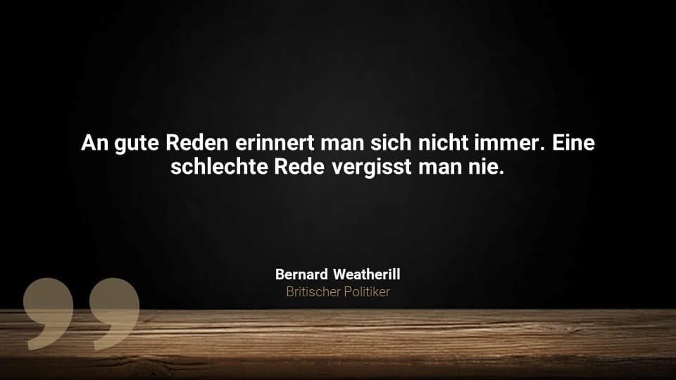 Zitat von Bernard Weatherill auf schwarzem Hintergrund über Bühne: An gute Reden erinnert man sich nicht immer. Eine schlechte Rede vergisst man nie.
