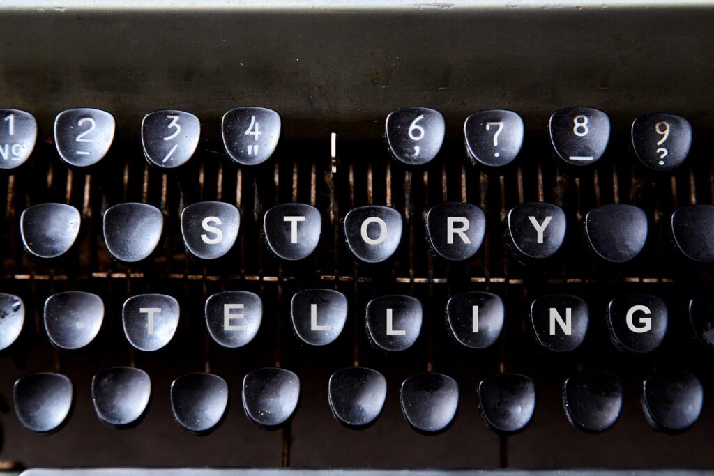 Schwarze Schreibmaschine, auf deren Knöpfen Storytelling geschreiben steht